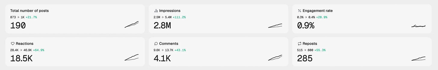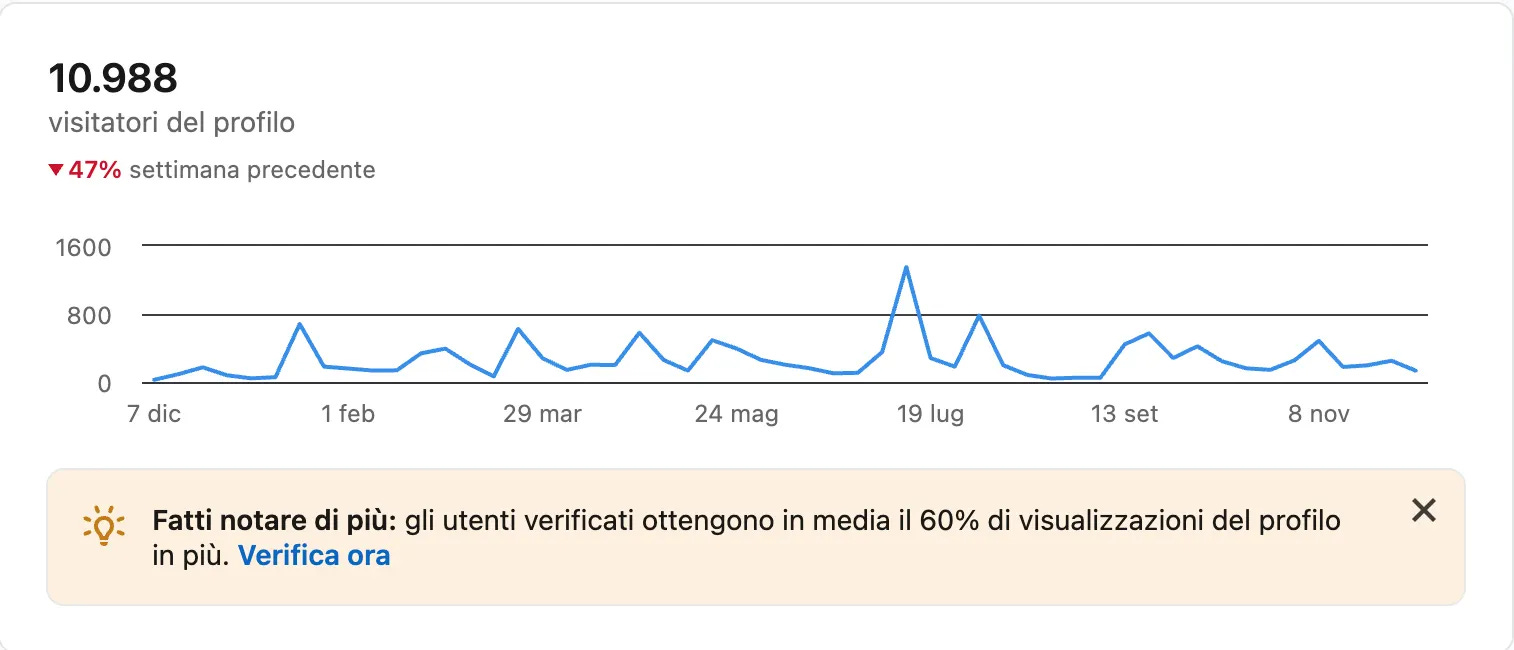 Per dare un contesto a questi numeri: se avessi voluto comprare 2.8 milioni di impression su LinkedIn con advertising, a un CPM medio di 35 euro, avrei speso circa 100.000 euro. Le ho ottenute con 208 ore di lavoro e zero budget pubblicitario. Non per dire che la pubblicità non serva, ma per far capire il valore reale di quello che molti liquidano come “fare un post”.