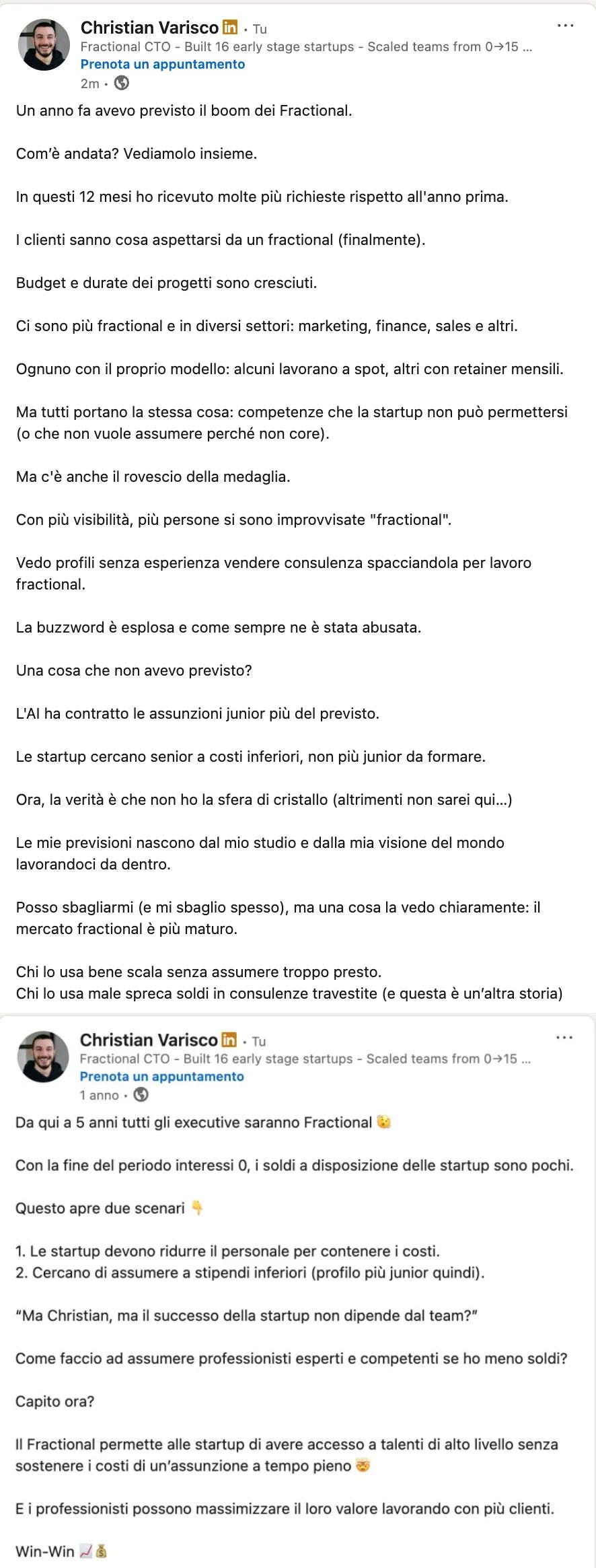 Tante persone mi hanno scritto per capire come entrare in questo mondo. Le startup cominciano a capire cosa fa un Fractional e perché ha senso. Anche gli investitori hanno cambiato prospettiva: avere figure Fractional in una startup non è più visto come un segnale negativo, ma come una scelta intelligente.