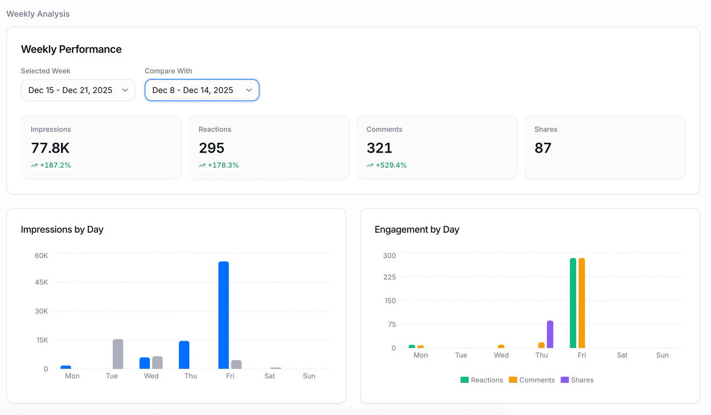 Shield ti mostra le analytics dei tuoi contenuti LinkedIn: impression, engagement, crescita followers. Tutto utile, ma è lento e poco funzionale.