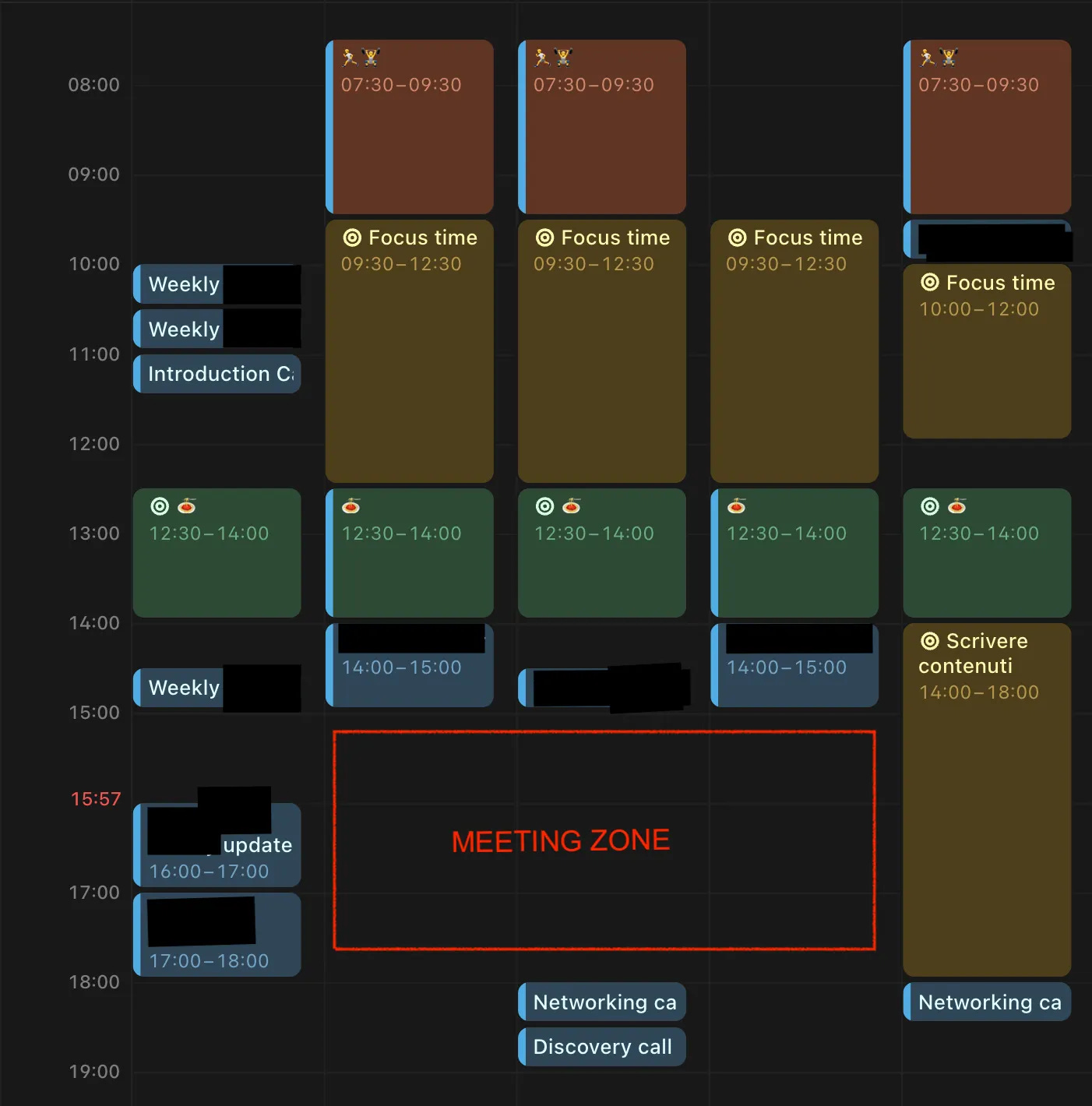 Lunedì: Solo meeting di update con i clienti e interni. Niente altro. Questo mi permette di allinearmi su tutto all’inizio della settimana e poi lavorare senza interruzioni.