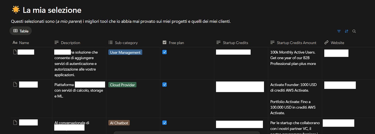 Però, per rendere la cosa più facile per tutti (e soprattutto a me), ho creato un listone di circa 100 tool che ho testato personalmente e selezionato per le startup con le quali lavoro.